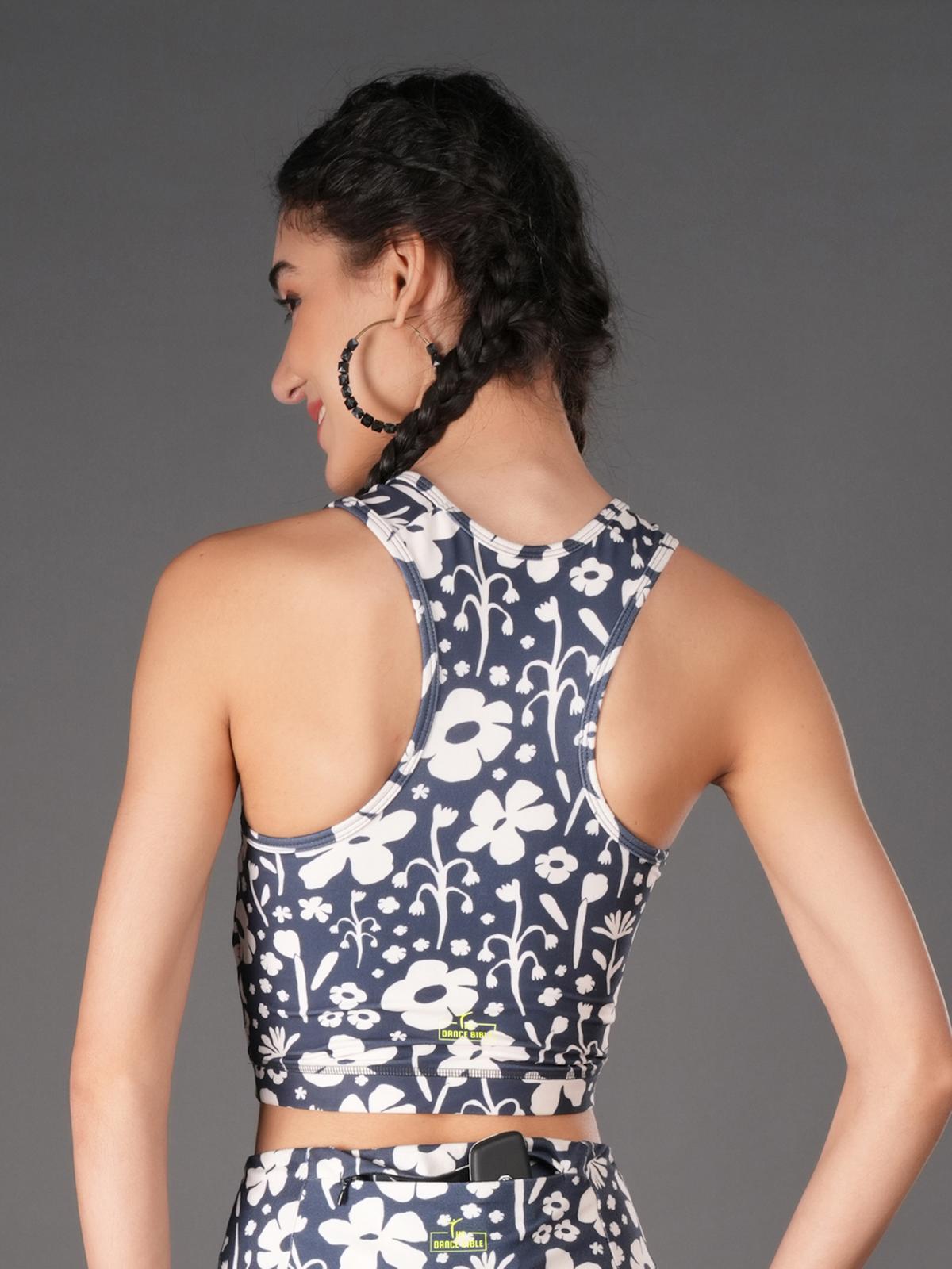 The matching padded sports crop top features removable cups for customizable comfort and a racerback design for full coverage.